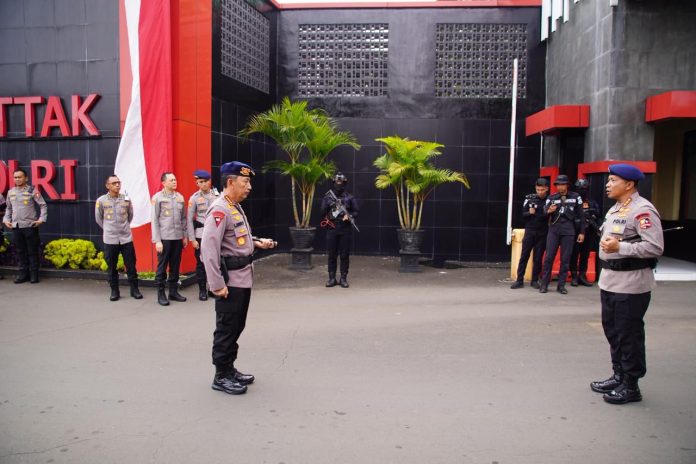 Depok – Kepala Kepolisian Negara Republik Indonesia, Jenderal Polisi Listyo Sigit Prabowo, memimpin apel pengarahan kepada personel Korps Brimob Polri yang dirangkaikan dengan pembukaan Rapat Kerja Teknis (Rakernis) Korps Brimob Polri Tahun 2026 di Lapangan Mako Korbrimob Polri Kelapadua, Cimanggis, Kota Depok, Jawa Barat, Selasa (21/4/2026).